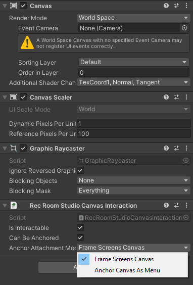 Create a Studio Prop that has a worldspace canvas (click here to learn how). On the canvas object, add the Rec Room Studio Canvas Interaction component. Toggle “Is Interactable'' and “Can Be Anchored”. If Can Be Anchored is set to True, you’ll see a dropdown called “Anchor Attachment Mode” appear with two options.