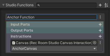 Create a new Studio Function (click here to learn how), drag the “Canvas” object into your instruction and under “RecRoomStudioCanvasInteraction” select the “AnchorCanvas” method. When executed in-game via a Studio Function chip, this will anchor your canvas in the selected mode.