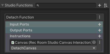 Create a new Studio Function (click here to learn how), drag the “Canvas” object into your instruction and under “RecRoomStudioCanvasInteraction” select the “DetachCanvas” method. When executed in-game via a Studio Function chip, this will detach your canvas and return control to the player’s avatar.
